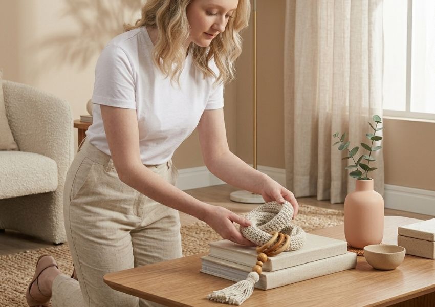 Colar de mesa de cerâmica texturizada + cesta de fibras + velas cria um ambiente acolhedor, perfeito para salas integradas.